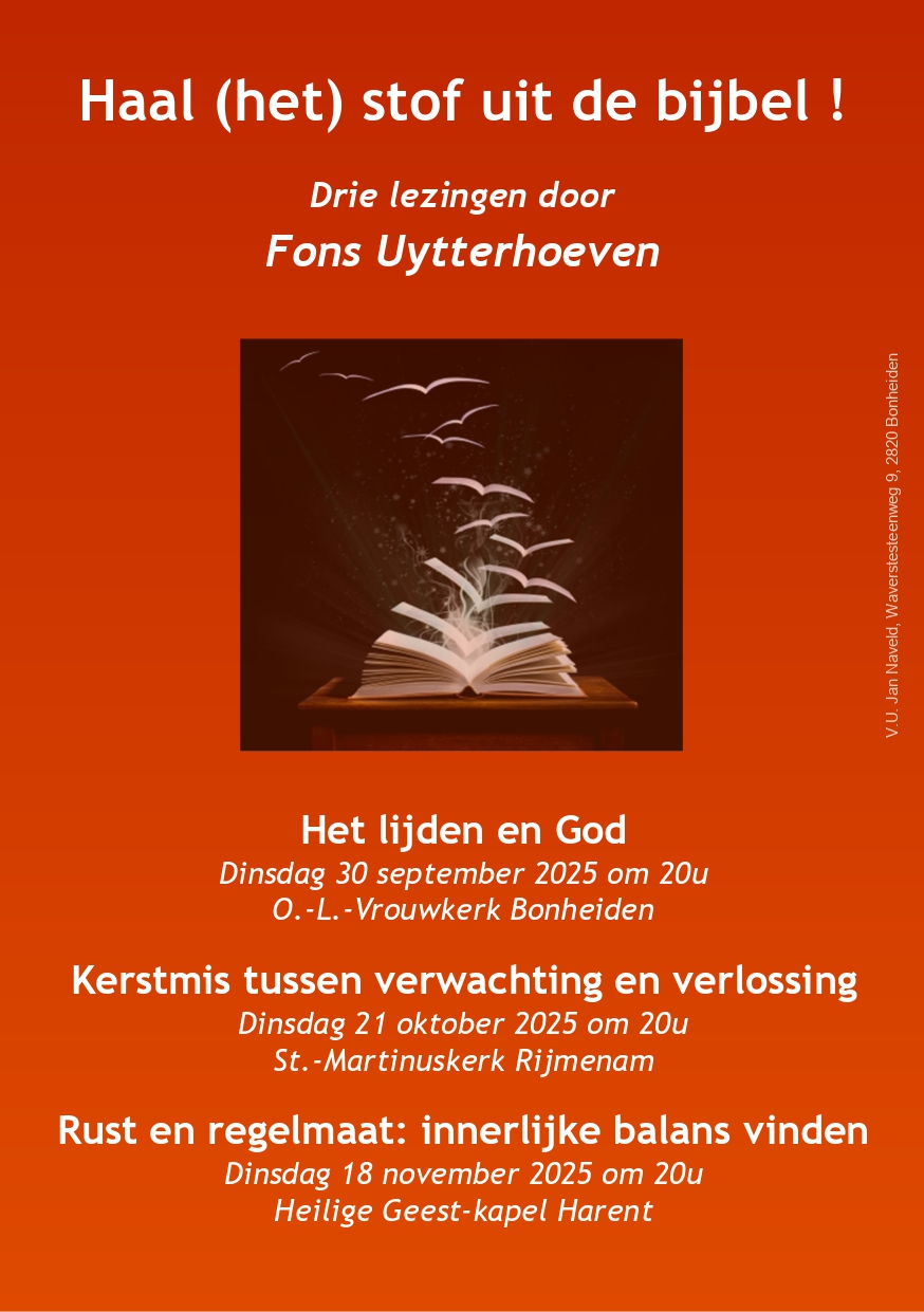 Voor het derde jaar op rij organiseren de parochies van Bonheiden, Rijmenam en de H. Geestkapel samen een reeks van drie lezingen onder de titel “Haal (het) stof uit de Bijbel”, gebracht door Fons Uytterhoeven.